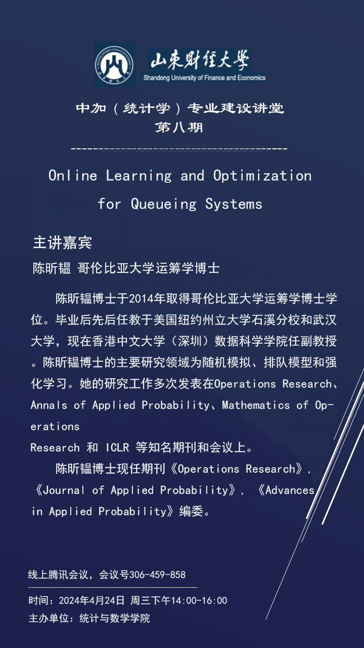 中加(统计学)专业建设讲堂第八期预告------Online Learning and Optimization for Queueing Systems