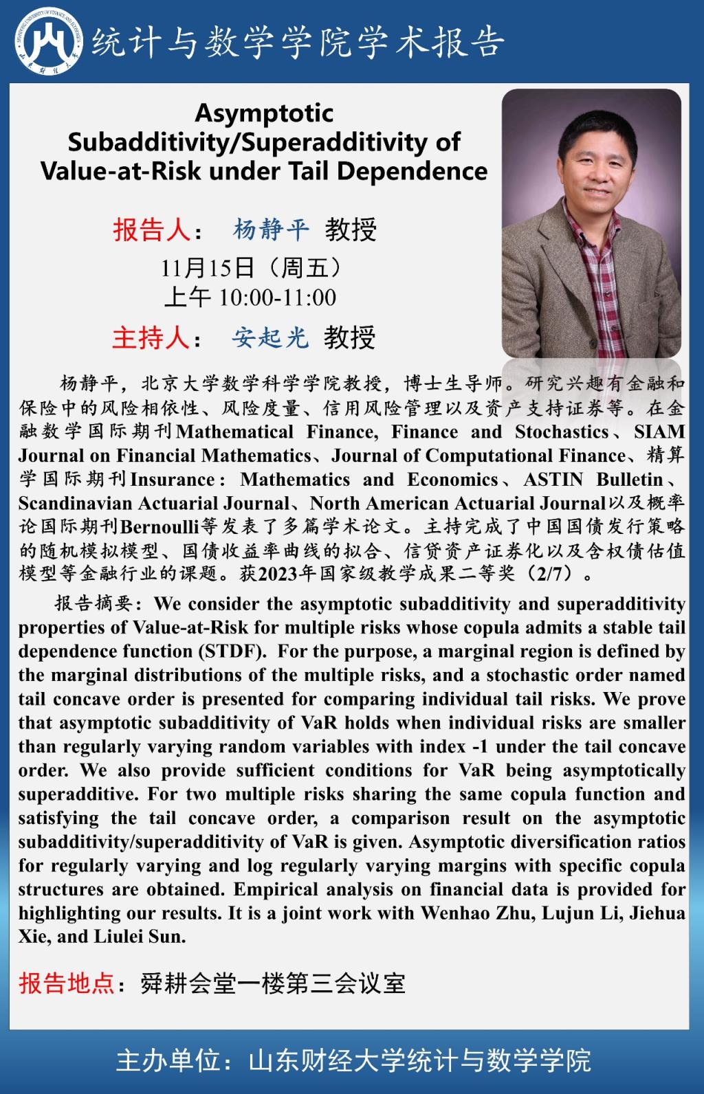 皇冠体育 学术预告—Asymptotic Subadditivity/Superadditivity of Value-at-Risk under Tail Dependence