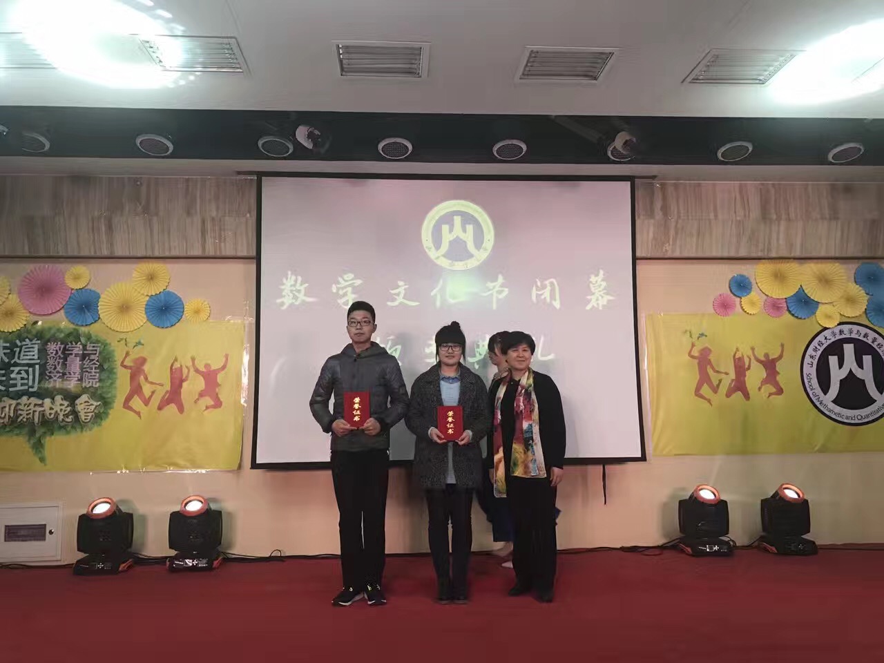 随后,进行了第二届数学文化节闭幕总结仪式,以及数学文化节之数学游艺活动颁奖仪式,由学院党委书记王建香书记为获得一等奖的队伍颁奖,由学院党委副书记赵连幸书记为获得二、三等奖的队伍颁奖。最终,伴随着最后一曲《爱,因为在心中》的悠扬旋律,数学与数量经济学院2016年数学文化闭幕暨迎新晚会也正式落下帷幕。两次休息时间穿插的抢红包片段富有特色,与同学们形成了良好互动。丰厚的礼品也充分调动了同学们的热情。