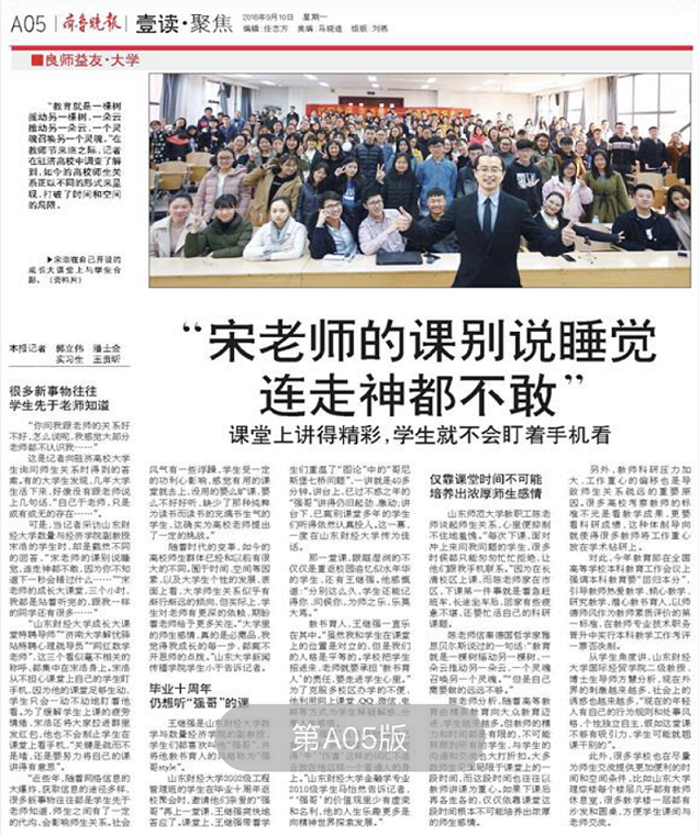 可是,当记者采访皇冠体育 数量与经济学院副教授宋浩的学生时,却是截然不同的回答,“宋老师的课别说睡觉,连走神都不敢,因为你不知道下一秒会错过什么……”“宋老师的成长大课堂,三个小时,我都是站着听完的,跟我一样的同学还有很多……”