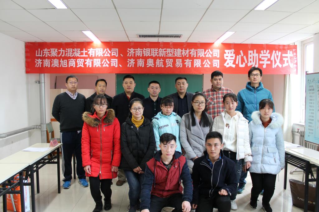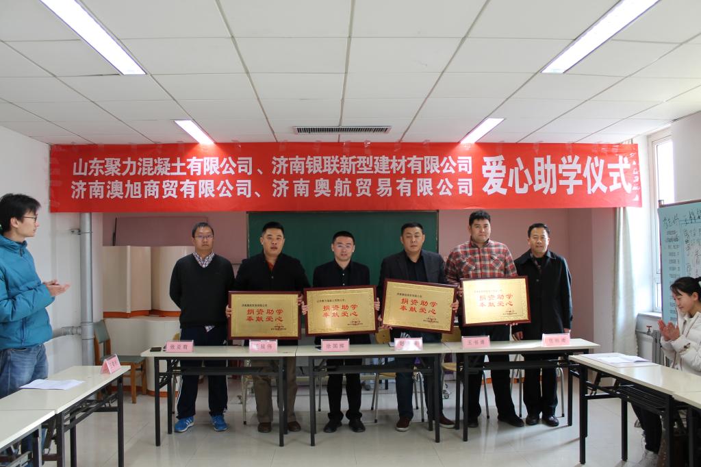 12月12日上午,聚力商砼助学金捐助仪式在圣井校区举行,聚力混凝土有限公司总经理徐国辉、济南银联新型建材有限公司总经理贾相帅、济南奥航贸易有限公司总经理王延伟、济南澳旭商贸有限公司总经理王书勇、皇冠体育 党委副书记赵连幸,团委书记王昊天、党委秘书张亚萌和全体受助学生及班级干部参加了活动。
