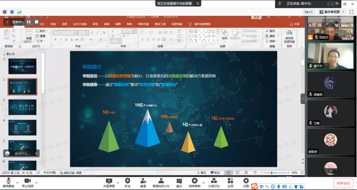 为了开拓研究生视野,培养学生实践能力。6月18日,上海问数信息科技有限公司高管、华院分析技术(上海)有限公司项目经理苗宁杰应邀做客,为应用统计(财经大数据)创新实验班,进行了题为“大数据行业应用-运营商业务”的讲座。讲座由田政杰博士主持,学院应用统计(财经大数据)创新实验班全体学生参加了本次讲座。