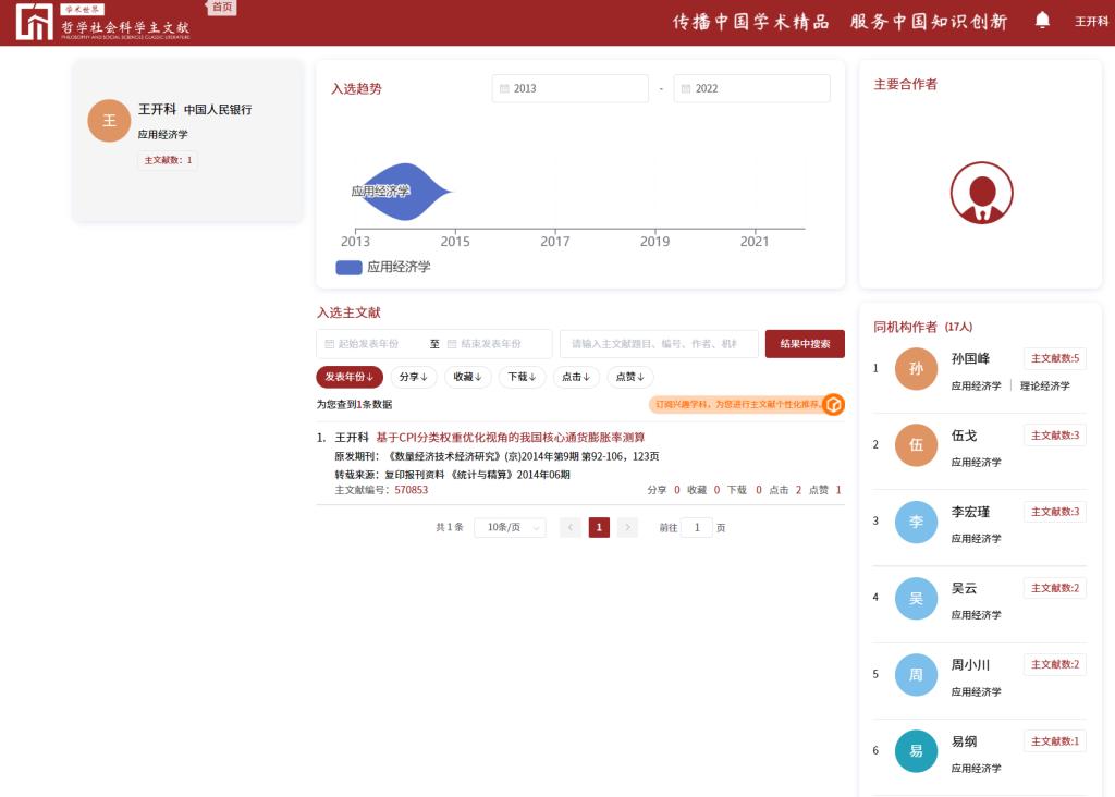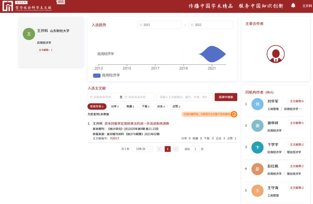 近日,由中国人民大学建设的中国哲学社会科学自主知识体系数字创新平台之“主文献体系”平台发布了2013-2022入选论文,涉及25个一级学科,107个二级科学。其中,统计学共遴选108篇主文献,皇冠体育 教师王开科2篇论文入选,分别是《资本回报率宏观核算法的进一步改进和再测算》(刊发于《统计研究》2020年9期,署名单位:皇冠体育 )、《基于CPI分类权重优化视角的我国核心通货膨胀率测算》(刊发于《数量经济技术经济研究》2014年9期,署名单位:中国人民银行)。
