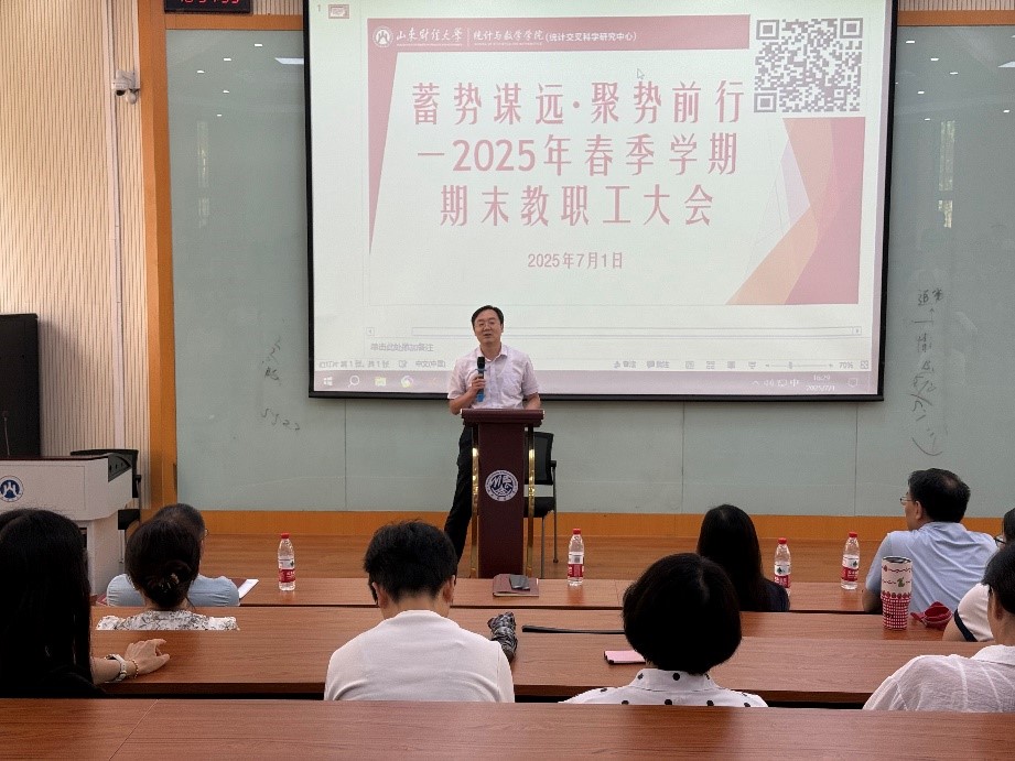 王敬政在总结讲话中对学院上半年各项工作给予充分肯定。他指出,学院在学科建设、教学成果、科研创新及社会服务等领域取得显著突破,尤其是统计学与数学学科的深度融合成效斐然,为学校加快建设新时代高水平财经大学作出了重要贡献。在肯定成绩的同时,王敬政对下一阶段工作提出明确要求:一是要聚焦“立德树人”根本任务,深化教育教学改革,构建“数智+”人才培养体系,强化课程思政与专业教育深度融合,全面提升人才培养质量;二是要畅通教职工职业发展通道,完善教师分类评价机制,加大对青年教师科研启动、学术交流的支持力度,打造高水平师资队伍。他勉励全体教职工以“攻坚克难”的锐气和“久久为功”的韧劲,为学院高质量发展凝聚磅礴力量。