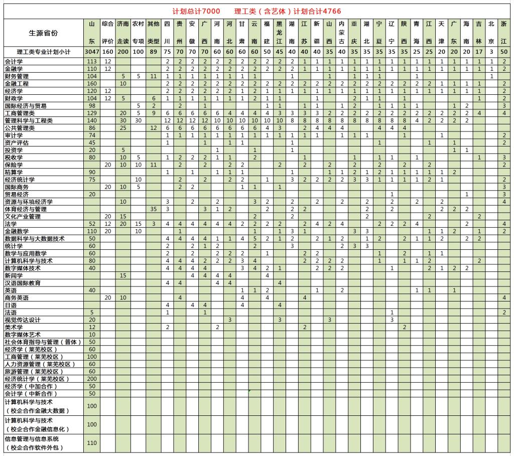 2019年,学校面向29个省份计划招收本科生7000人。其中山东省计划招收4885人,共有9种招生类型,各类型招生计划分别为:普通类2715人,艺术类140人,普体类50人,济南走读350人,农村专项160人,综合评价260人,中外合作办学200人,校企合作办学310人,莱芜校区700人;学校在28个外部省份计划招收1990人,其中普通类1930人,艺术类60人;学校其他类型(内高班、高水平运动队及预科生转正)招生计划为125人。