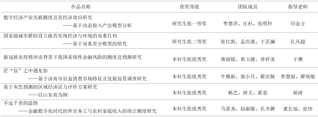 在田金方教授的指导下,李慧萍、庄杉、张明轩同学的作品“数字经济产业关联测度及其经济效应研究——基于动态投入产出模型分析”荣获全国总决赛一等奖;由孔凡超老师指导的张红凯、孟庆港、于芷澜同学的作品“国家级城市群的设立能否实现经济与环境的双重红利—基于双重差分模型的研究”荣获全国总决赛二等奖;还有于渊、李慧丽、翟艳敏、郝涛、董长瑞、张伟老师指导的其他四支队伍获得全国优秀奖。