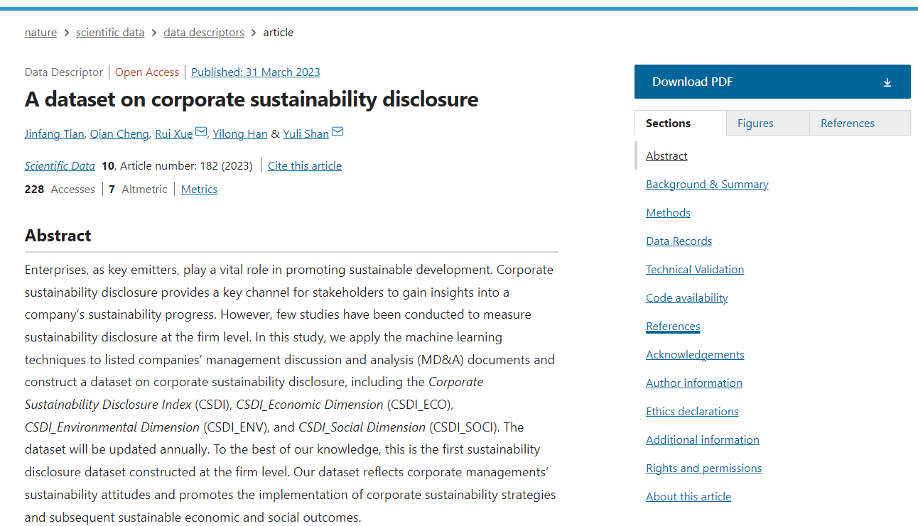 近日,皇冠体育 (统计交叉科学研究中心)田金方教授合作团队构建的企业可持续性信息披露指数以期刊论文“A dataset on corporate sustainability disclosure”的形式发表于Nature子刊《Scientific Data》(//doi.org/10.1038/s41597-023-02093-3)。该期刊实时影响因子12.5,JCR分区Q1,系我校A1类期刊。