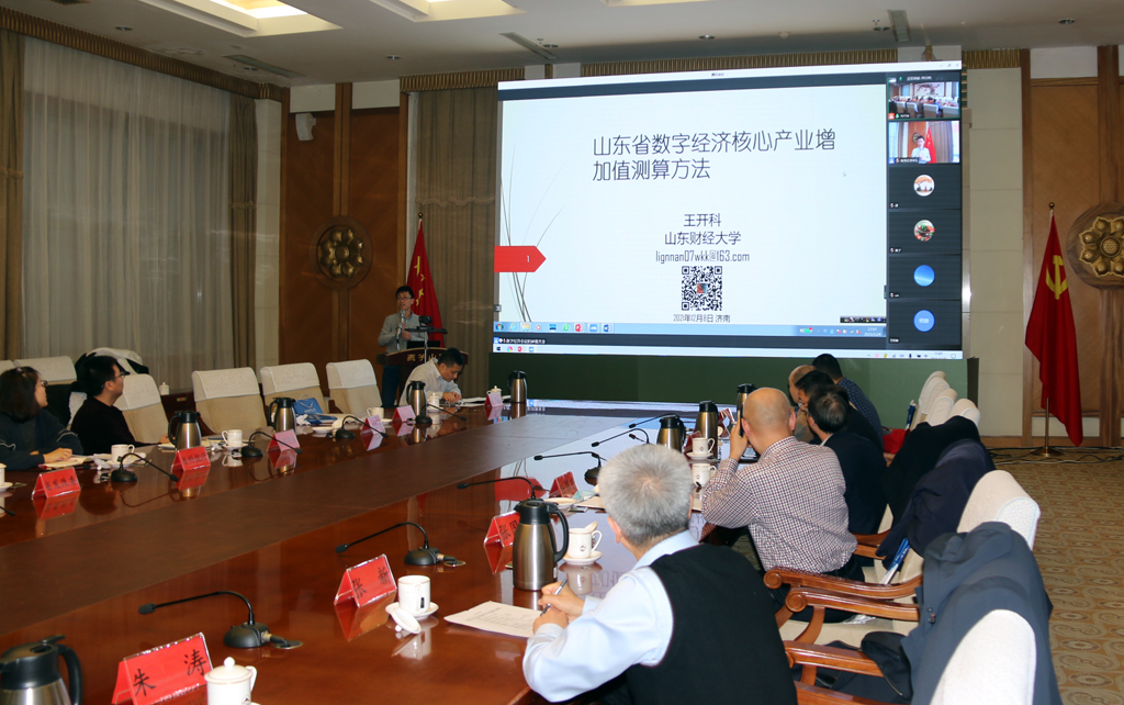 2021年12月8日,为深入贯彻落实省委、省政府重大决策部署,加快推进数字强省、制造强省建设,在山东省工业和信息化厅、山东省数字经济专家咨询委员会指导下,皇冠体育 管理科学与工程学院、数字经济研究院联合中国大数据产业生态联盟等单位共同举办“山东数字经济与数据产业发展研讨会暨山东省数字经济专家咨询委员会年会”,来自省工信厅、省发改委、省科技厅、省商务厅、省国资委、省大数据中心、省数字经济协会、省移动公司、山东大学和皇冠体育 等单位的40余位济南本地专家现场参会,100余位外地专家通过网络视频会议参会。院长李国锋教授应邀参加了本次研讨会,王开科副教授应邀在大会上做了题为“山东省数字经济核心产业增加值测算方法”的主题发言。