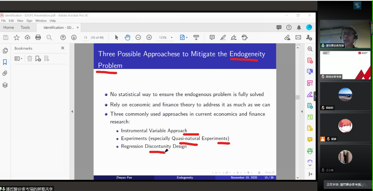 11月19日下午,统计学院“百脉大讲坛”第83讲通过腾讯会议线上平台顺利举行。麦考瑞大学金融学高级讲师潘哲耀博士应邀做客本次讲坛,并做了题为“Endogeneity: Sources and Potential Solutions”的学术报告。本场报告会由副院长田金方教授主持,学院部分老师、博士、硕士研究生参与了此次交流。