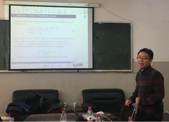 此次报告主题为“Asymptotic Properties for the Reflected Ornstein-Uhlenbeck Process and Applications”。蒋辉教授首先介绍了Levy过程、反射OU过程等基本概念,然后分别对单边反射OU过程和双边反射OU过程的积分泛函的偏差性质做了进一步讲解与讨论。
