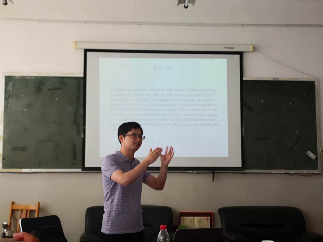 此次报告的主题是“Rank estimator of the factor number: random perturbation, expansion and central limit theorem”,该报告通过数据驱动的策略,在研究金融危机前后分别选取1000只股票的日收益率作为观测变量,通过因子分析的方法计算公共因子的个数,比较金融危机前后因子个数是否具有显著差异。为了解决这个问题,孔新兵教授采用投资组合对冲的方式消除特殊因子的影响,采用主成分的思想进行降维处理,使用矩阵行列式和秩的运算构造了因子个数的估计量并得到了估计量的渐近分布,并以此为基础构造检验统计量进行假设检验。另外,孔教授还通过数值模拟的方法说明了该方法能够有效的控制犯第一类错误并有很好的功效表现,该方法在一定程度上填补了此领域的空白。