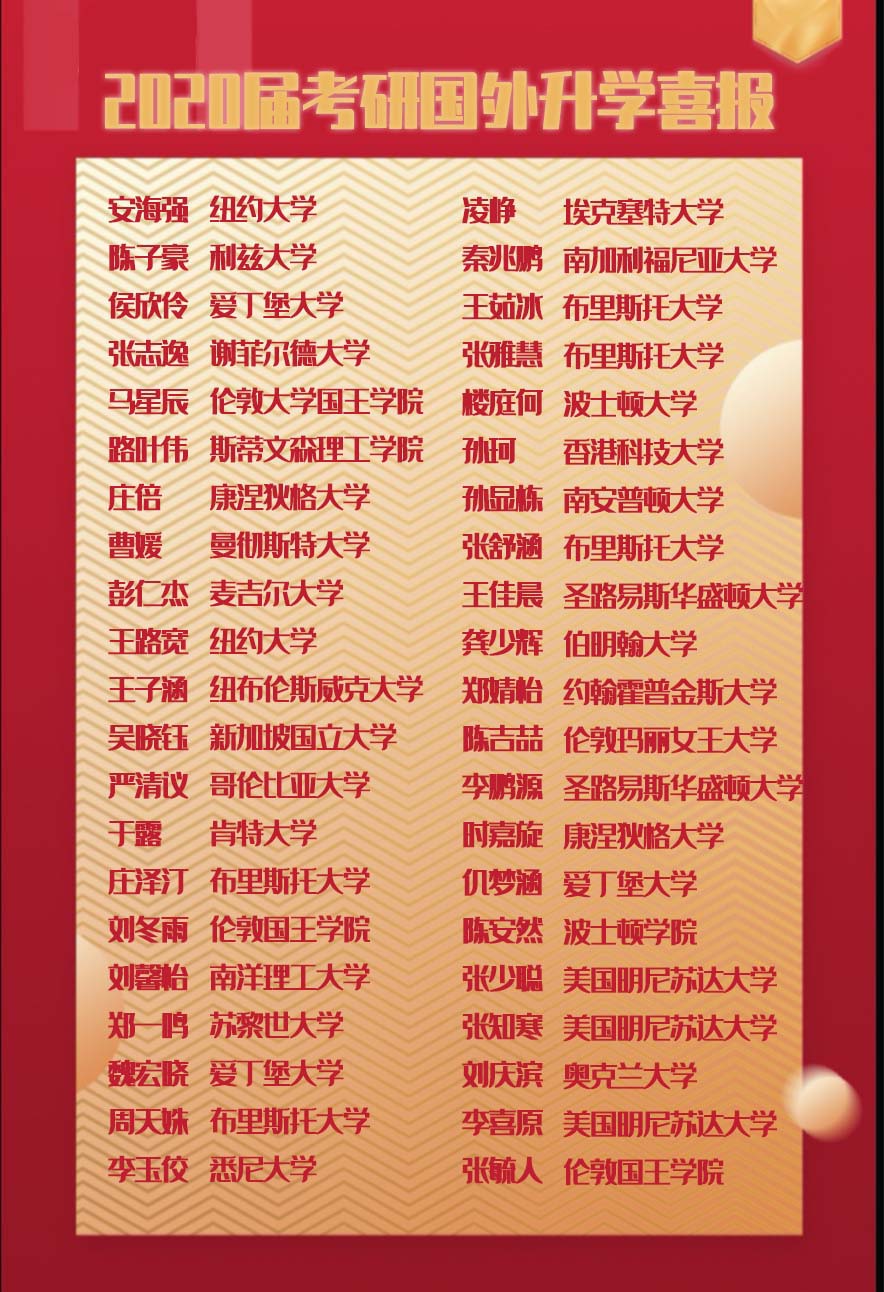 皇冠体育 2020届本科毕业生共有393人,截止至目前,共有126人考取国内外研究生,国内外考研率达到32.06%。其中,有82人考入国内院校,国内考研录取率20.87%;有44人拿到国外院校录取通知,出国深造率高达11.20%。